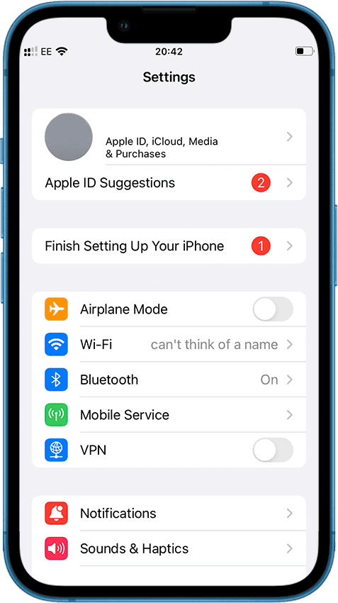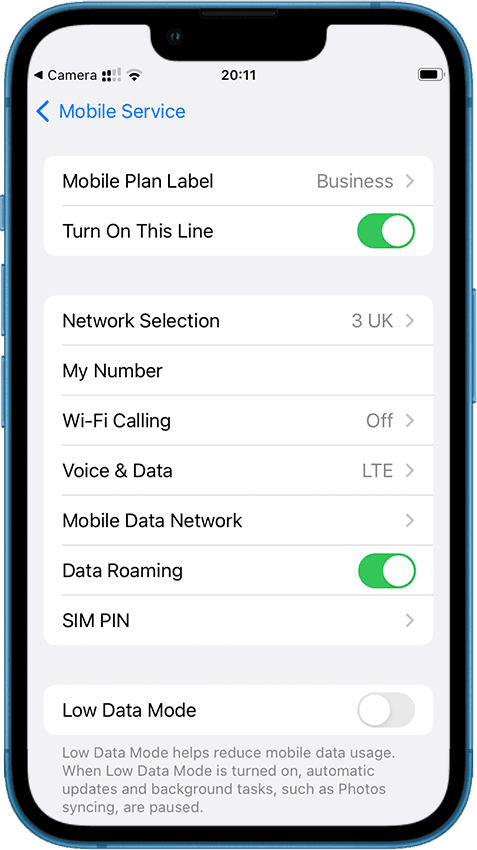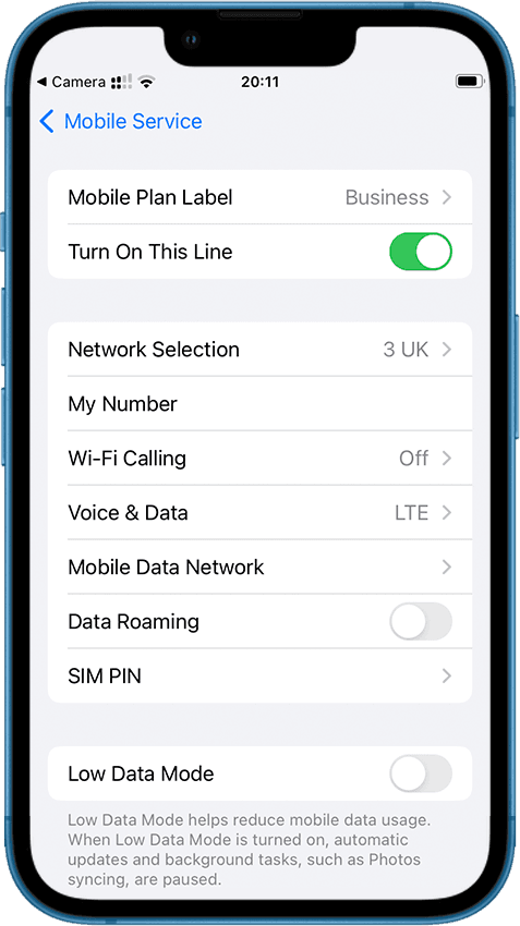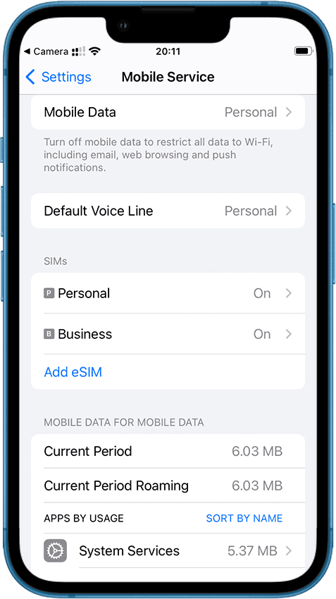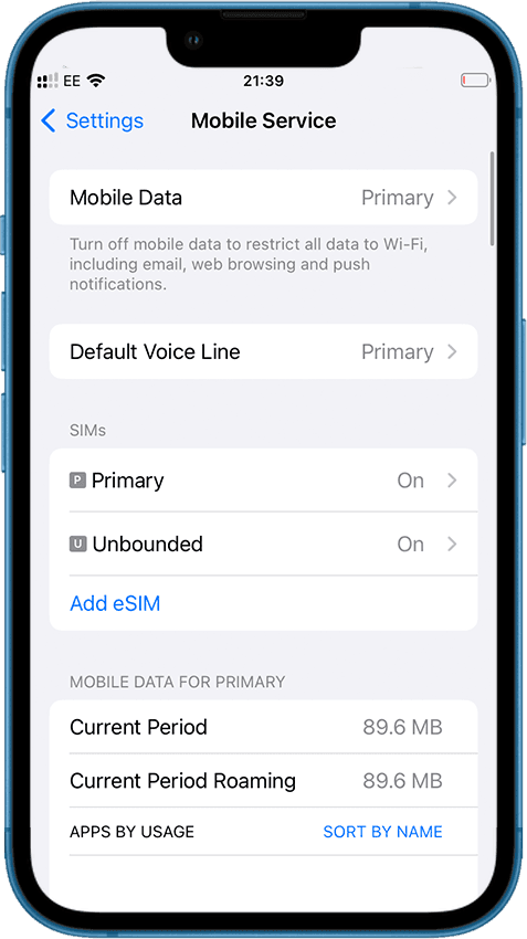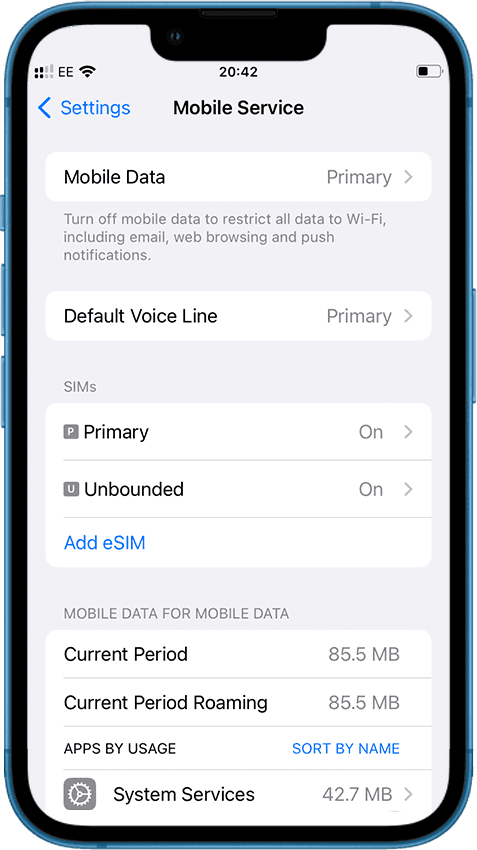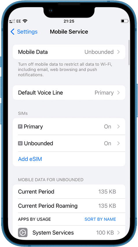 On the ‘Mobile Service’ page, tap your Unbounded SIM (the second one on the list) to configure it.