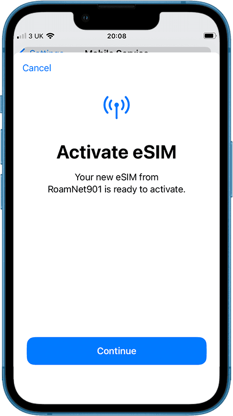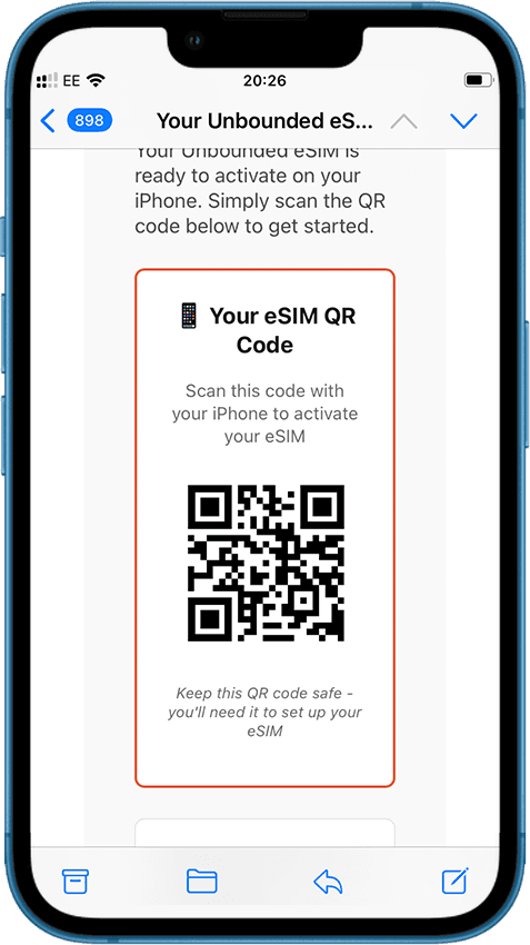 Press and hold the QR code in our email, then tap ‘Add eSIM’. Or, scan the QR code with your phone’s camera using another device.