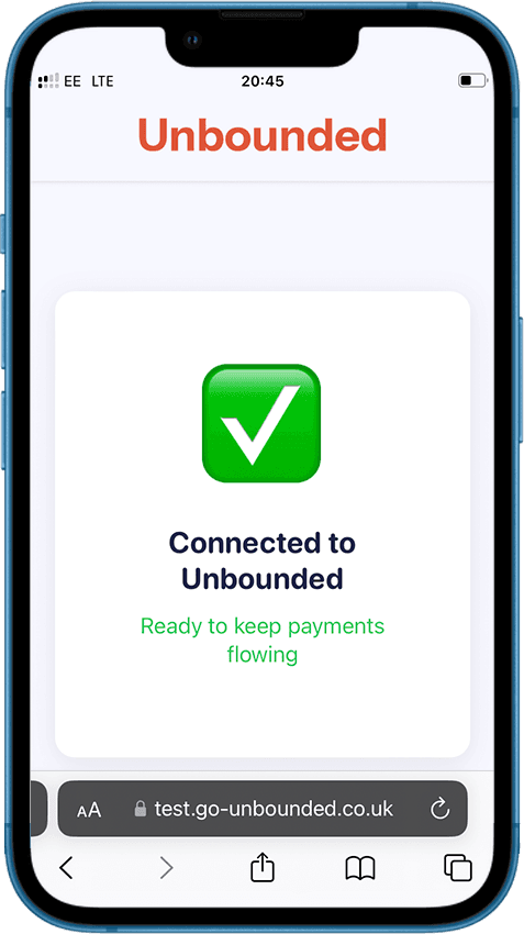 Go to www.test.go-unbounded.co.uk . If you see a green tick, you're connected.